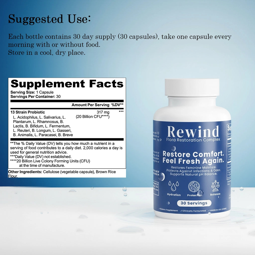 Rewind's 13 probiotic strains were specifically selected for vaginal colonization—based on clinical research showing 94% colonization rates within 4 weeks.
